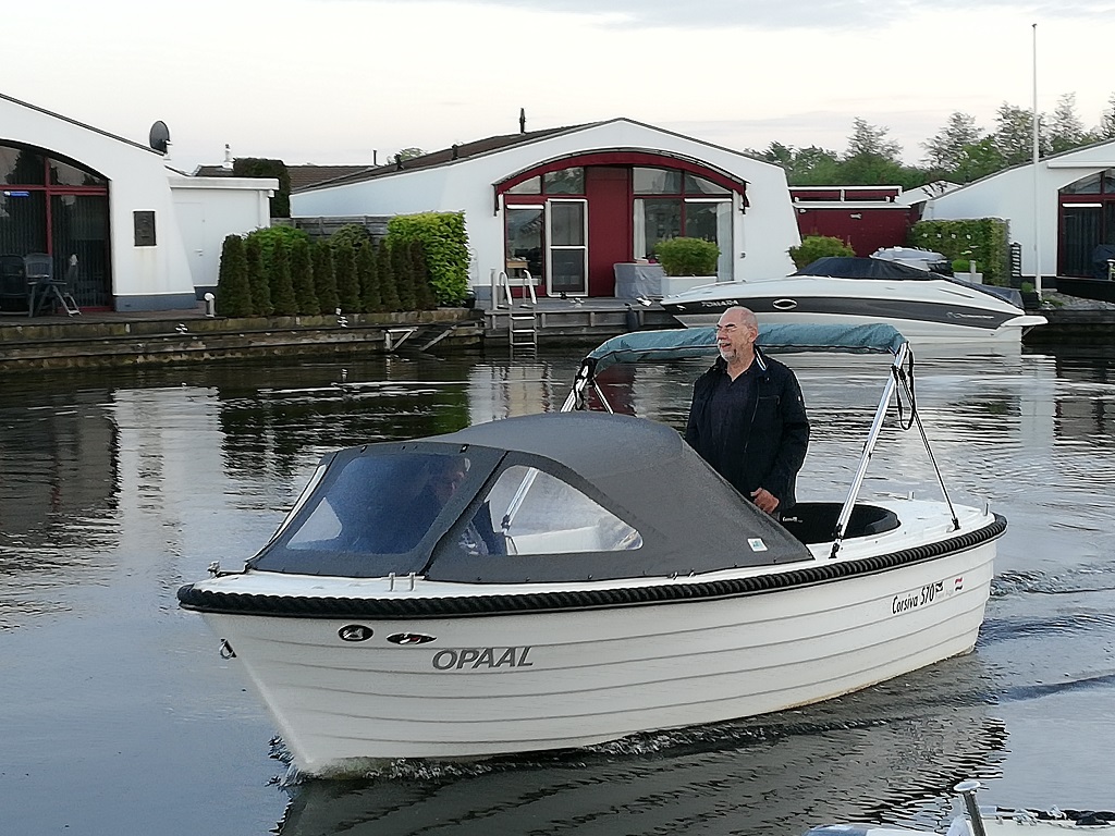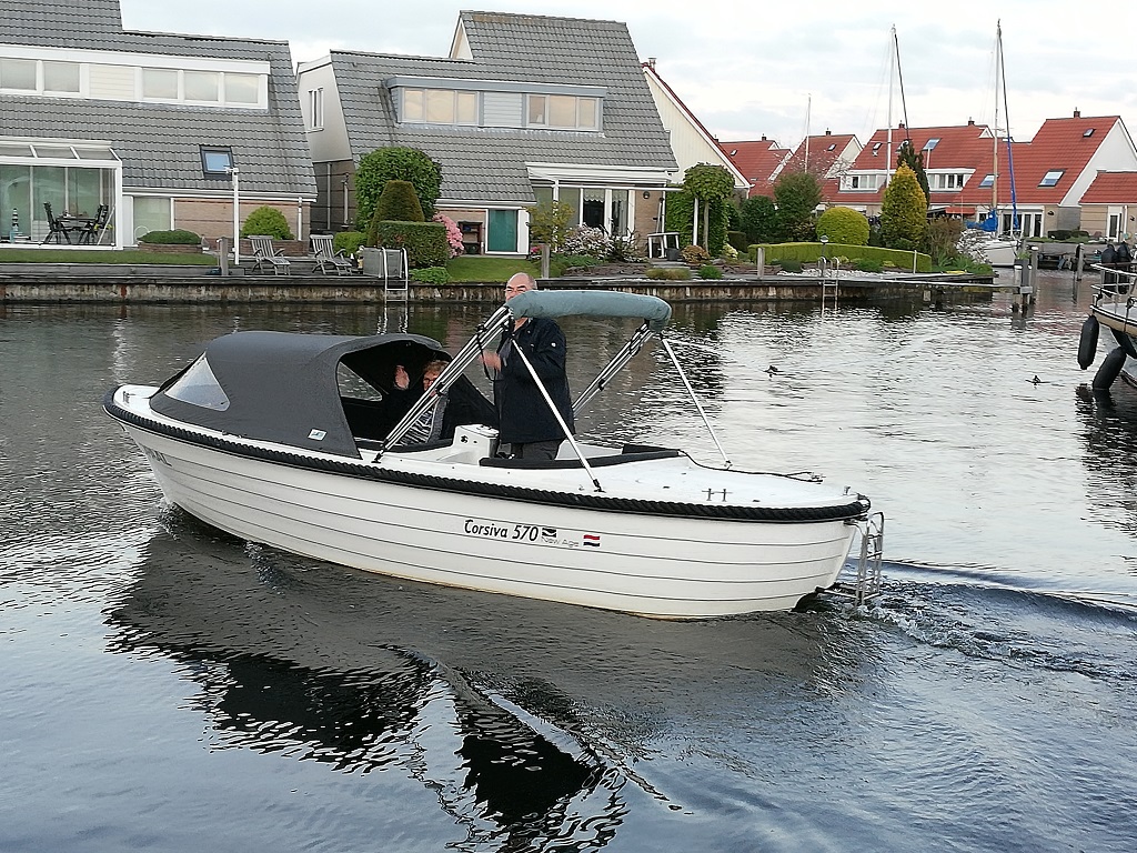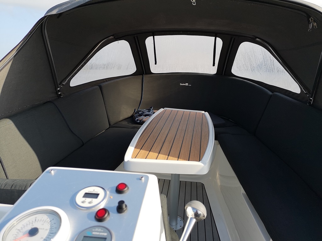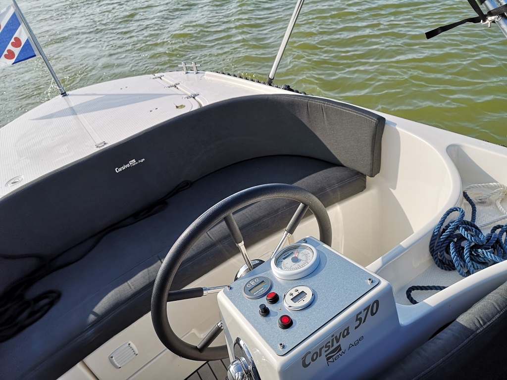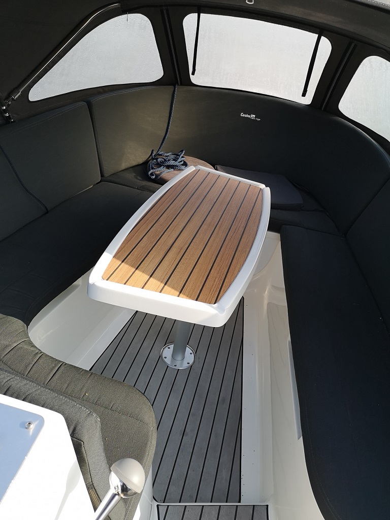 Die Sloep Corsiva 570 Tender hat eine Rundsitzgruppe für 4 - 5 Personen im Bug, die auch zur Sonnenliege umgebaut werden kann. Die Sitzbank im Heck ist gut mit zwei Personen zu nutzen Das Cabrio kann komplett geöffnet werden, zusätlich ist ein Biminitop vorhanden. Eine Badeleiter ist am Heck fest installiert.