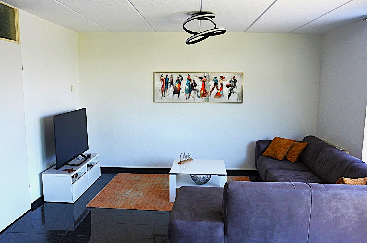 Gästehaus innen:Ein gemütliches Zimmer ist hier eingerichtet, mit Doppelbettschlafsofa, Tisch, Kleiderschrank, Fernseher und Waschbecken.